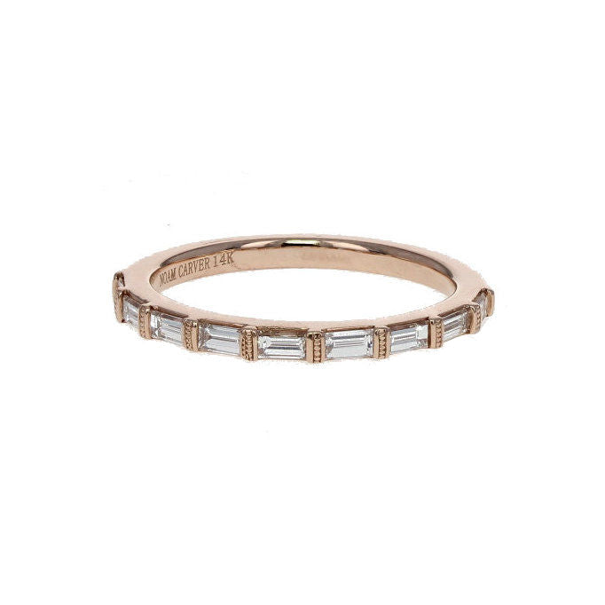 A 14K Rose Gold ring with east/west baguette diamonds, totaling 0.49 carat. Part of our Bridal Collection.