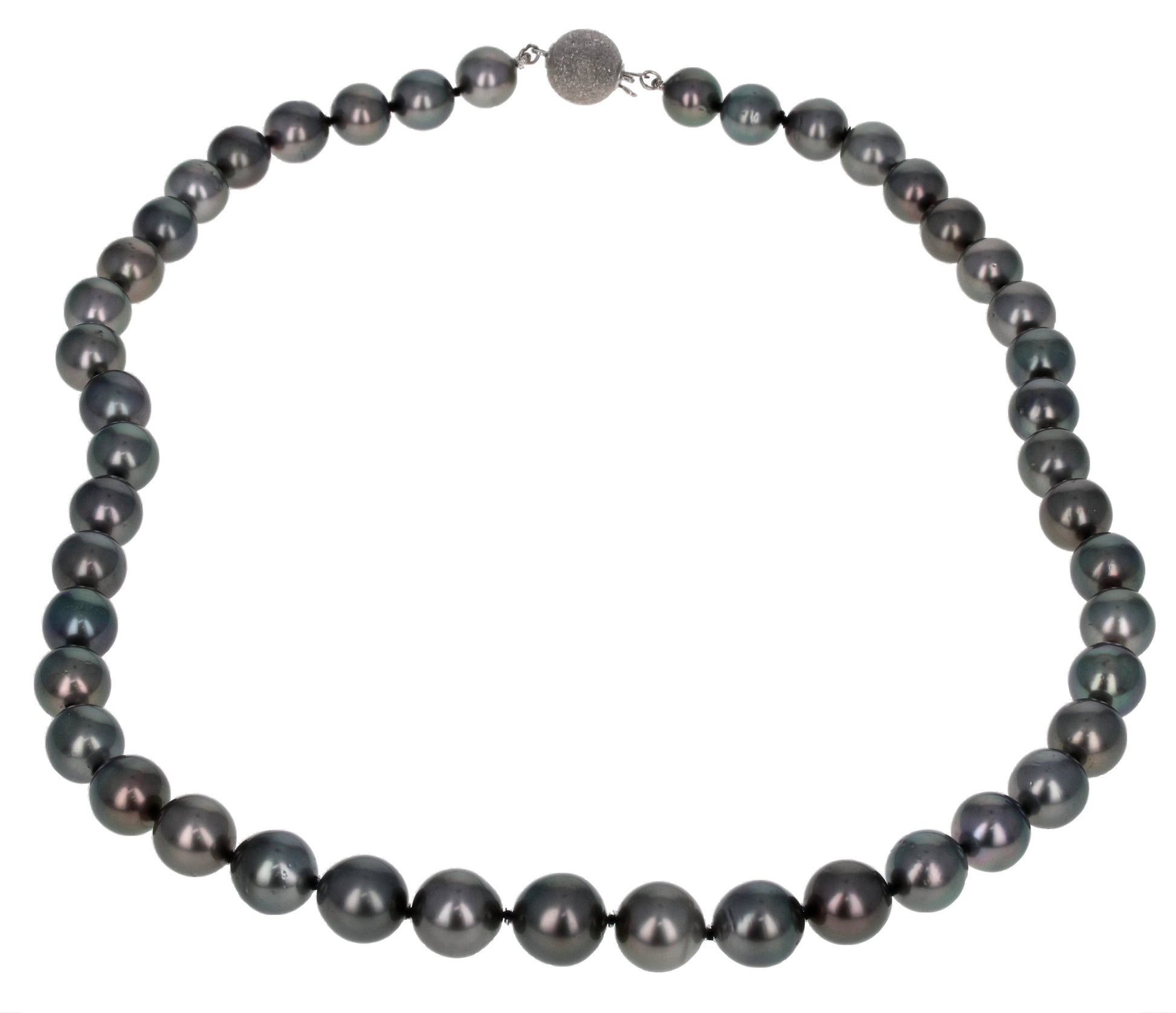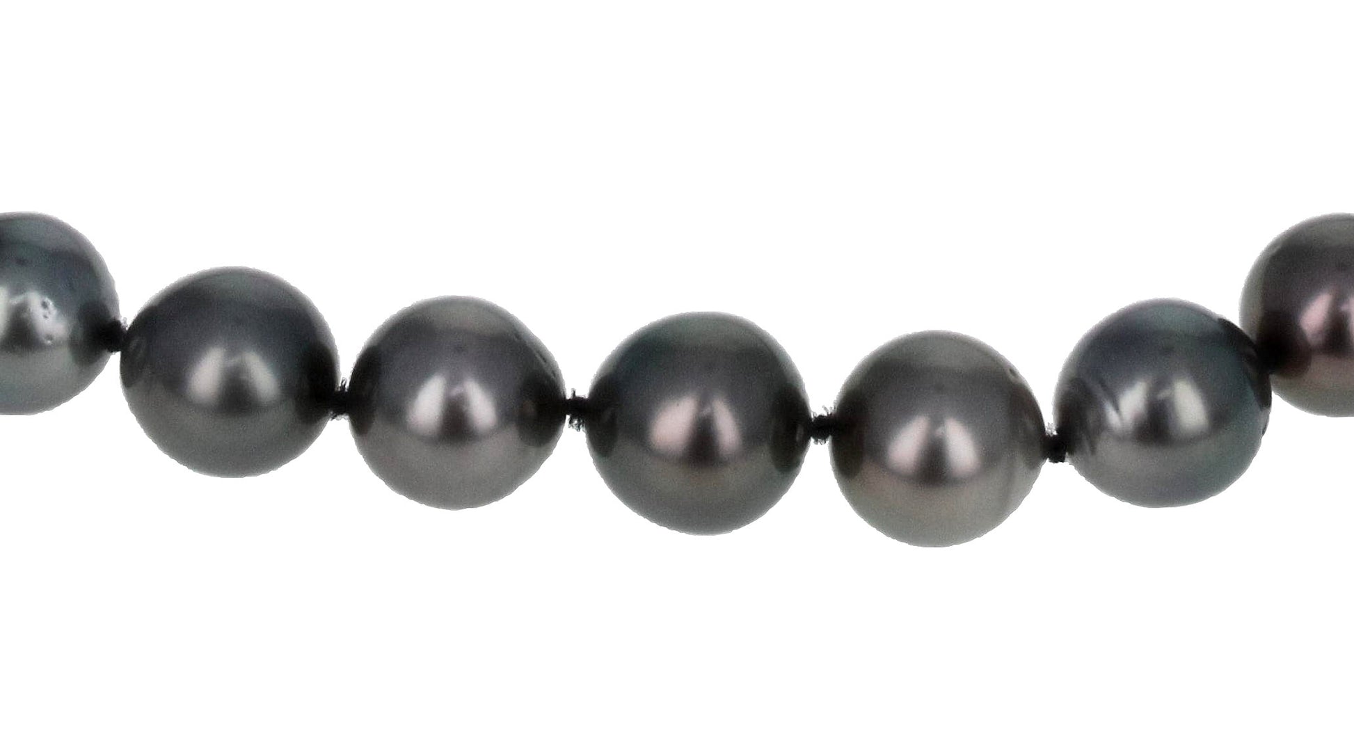 Black Tahitian cultured pearl necklace with a 14K White Gold brushed-finish clasp. Graduated pearls measure 8-10mm, 18" in length, and "AA" quality. Our Tahitian cultured pearls are cultivated in the "Pinctada margaritifera oyster", commonly known as the black lipped oyster, which are found in the warm waters of French Polynesia in the South Pacific. Part of our Perla Collection.