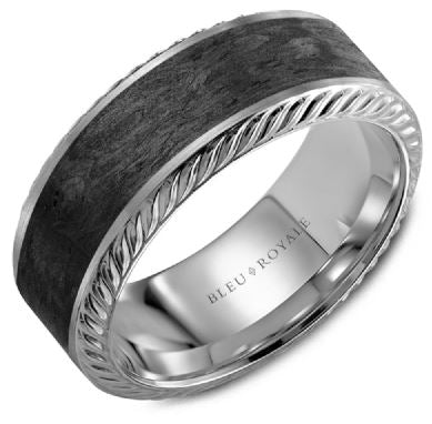 Men's wedding band featuring a black Carbon Fiber top and 14K White Gold polished band with rope detail edges. 7mm wide, and finger size 10.