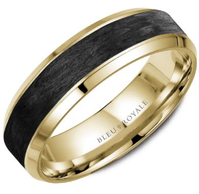 Men's wedding band featuring a black Carbon Fiber top and polished 14k Yellow Gold beveled edges. This ring is 6mm wide and a finger size 10 but is available in other sizes in-store.