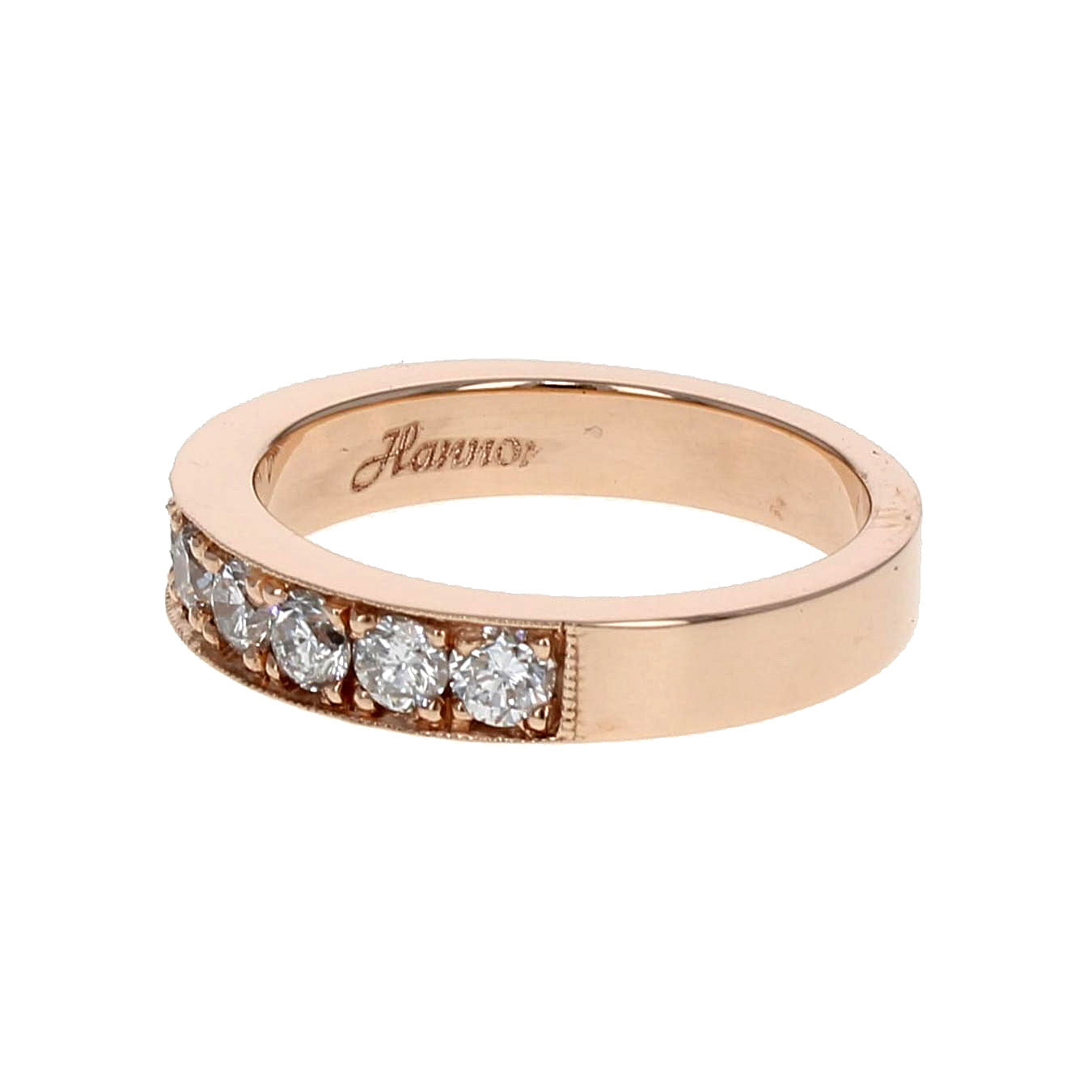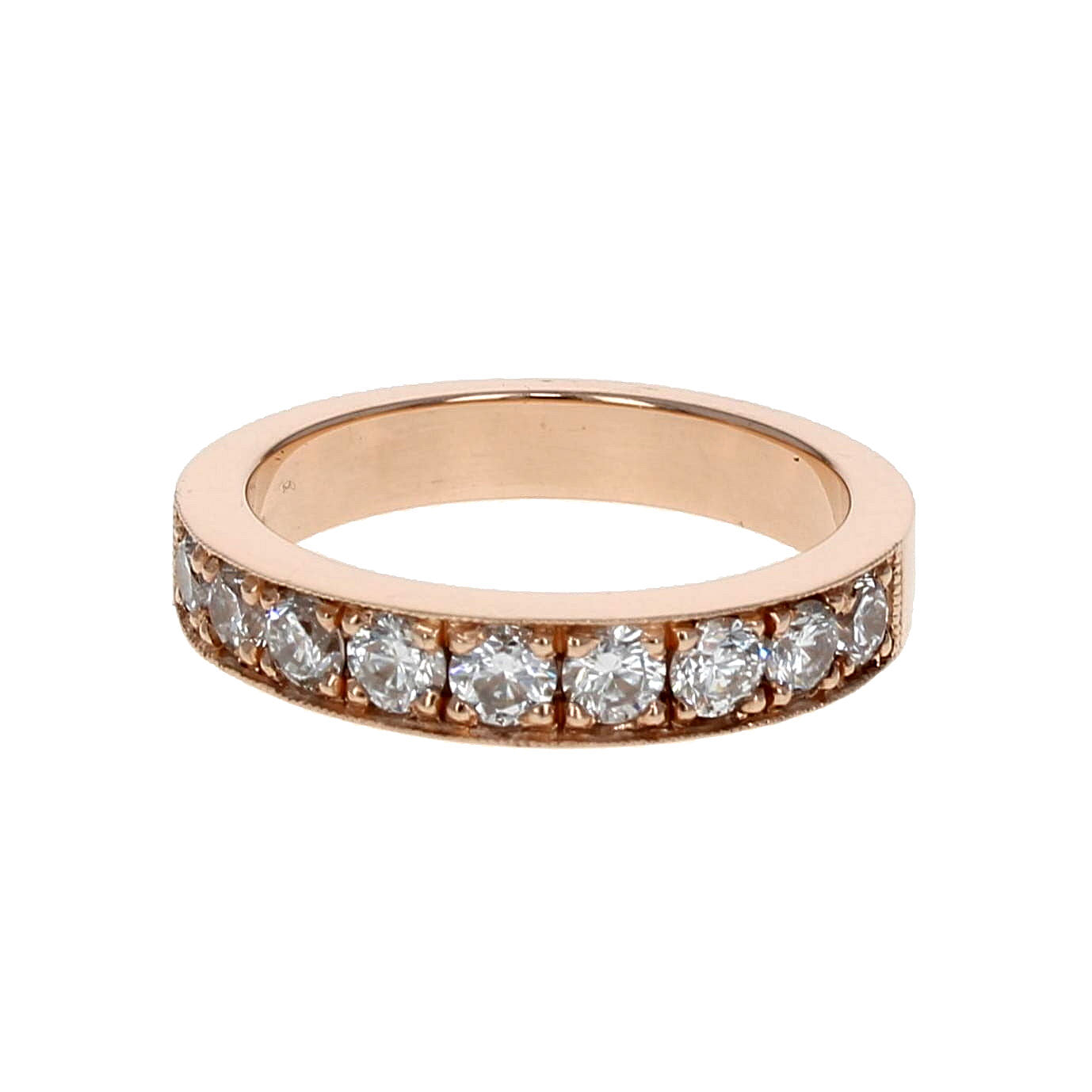 A 14K Rose Gold band with 9 Round Brilliant Cut diamonds, H/SI-1, and totaling 0.91 carat. There is a milgrain design surrounding the diamonds. Part of our Bridal Collection.