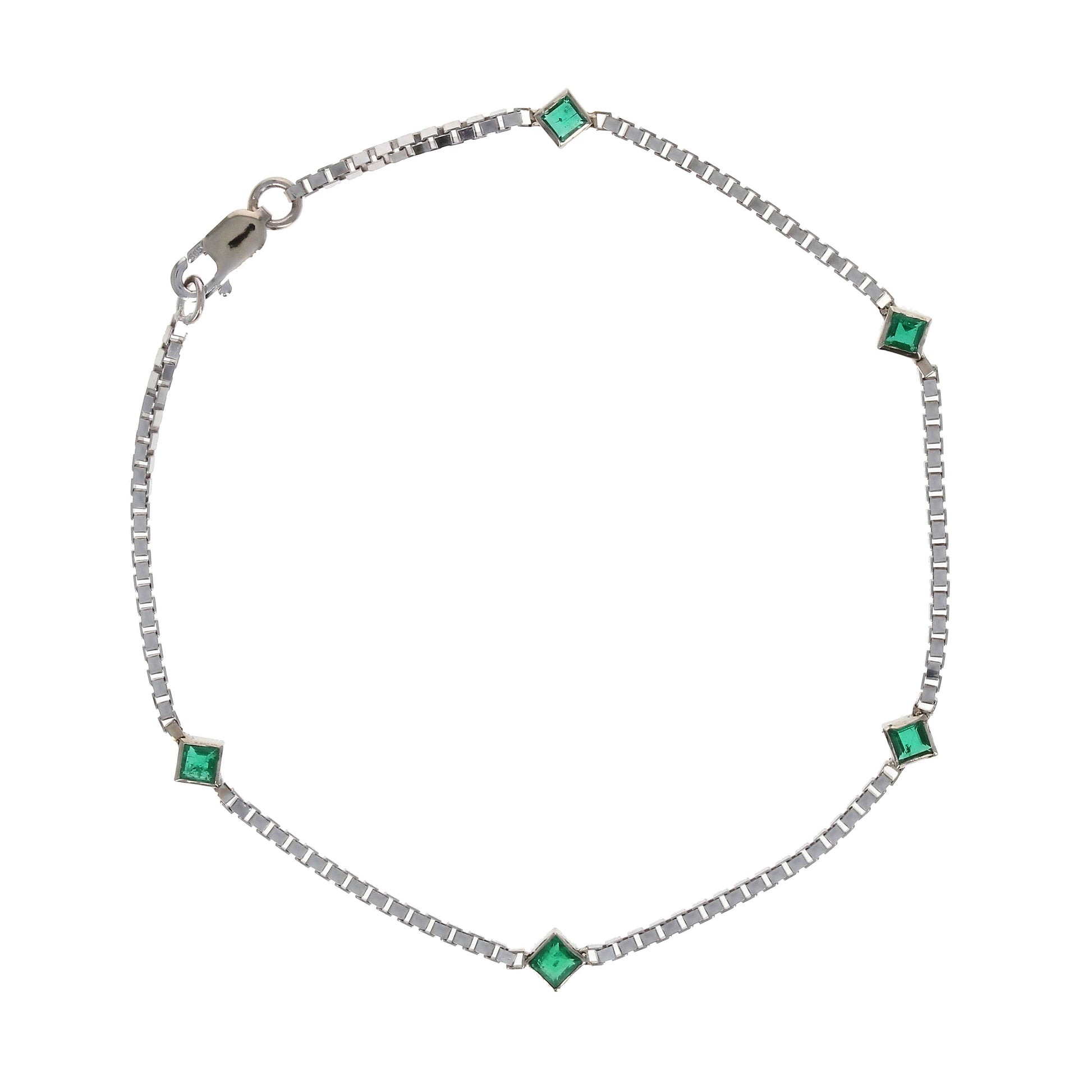 A station bracelet with five natural emeralds totaling 0.50 carat. Set in 14K White Gold, on a 14K White Gold box chain that measures 7 inches long. Part of our Colores Collection.