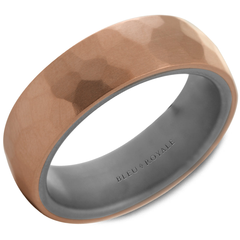 A 14K Rose Gold and Tantalum men's band with a flat hammered top. This ring is a finger size 10, 7.0 mm wide, and can be ordered in different sizes.