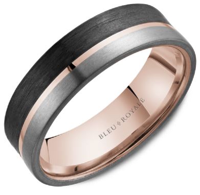 A 3-tone wedding band featuring Tantalum, 14k Rose Gold, and black Carbon Fiber. This band is 7.5mm wide and size 10, but available in other sizes.